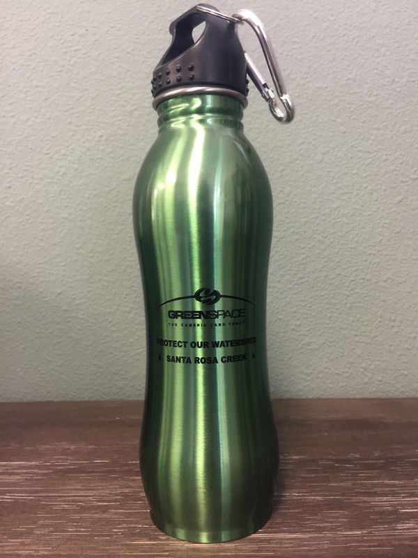 Green, stainless steel water bottle with screw-on cap and carabiner clip. Greenspace logo in black and text reading: PROTECT OUR WATERSHED SANTA ROSA CREEK. The bottle is not dishwasher safe.