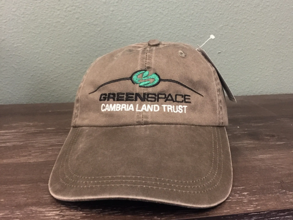 Olive-green baseball cap with Greenspace logo embroidered on the front, and an adjustable leather strap in the back for better fit.